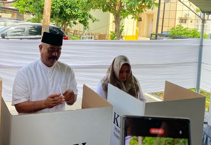 PSU DI TPS 22 : Bupati Kukar Edi Damansyah, didampingi isterinya di TPS 22 Kelurahan Timbau, saat memberikan Hak Pilihnya dalam Pemungutan Suara Ulang (PSU). (foto: rob)